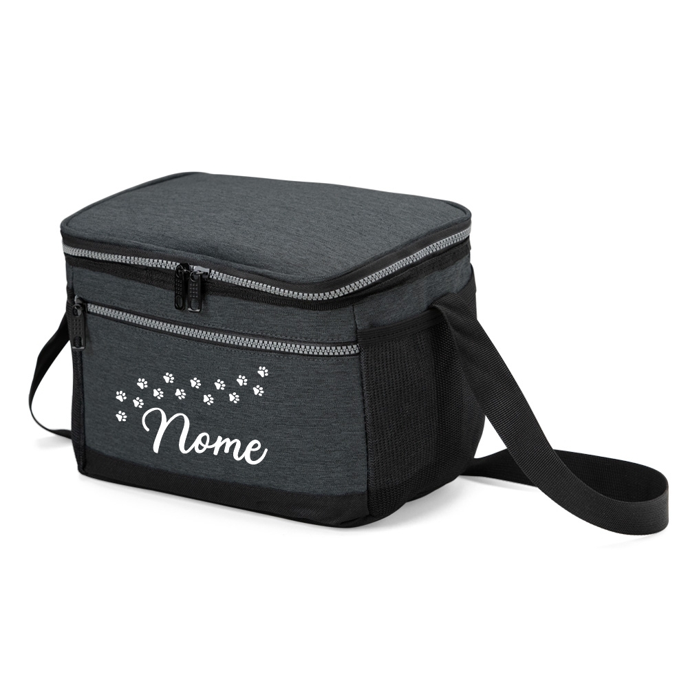 Bolsa térmica de nylon 10 litros com dois compartimentos, sendo o principal com revestimento térmico e bolso telado para utensílios. Possui bolsos laterais em malha e alça transversal com apoio para ombro.