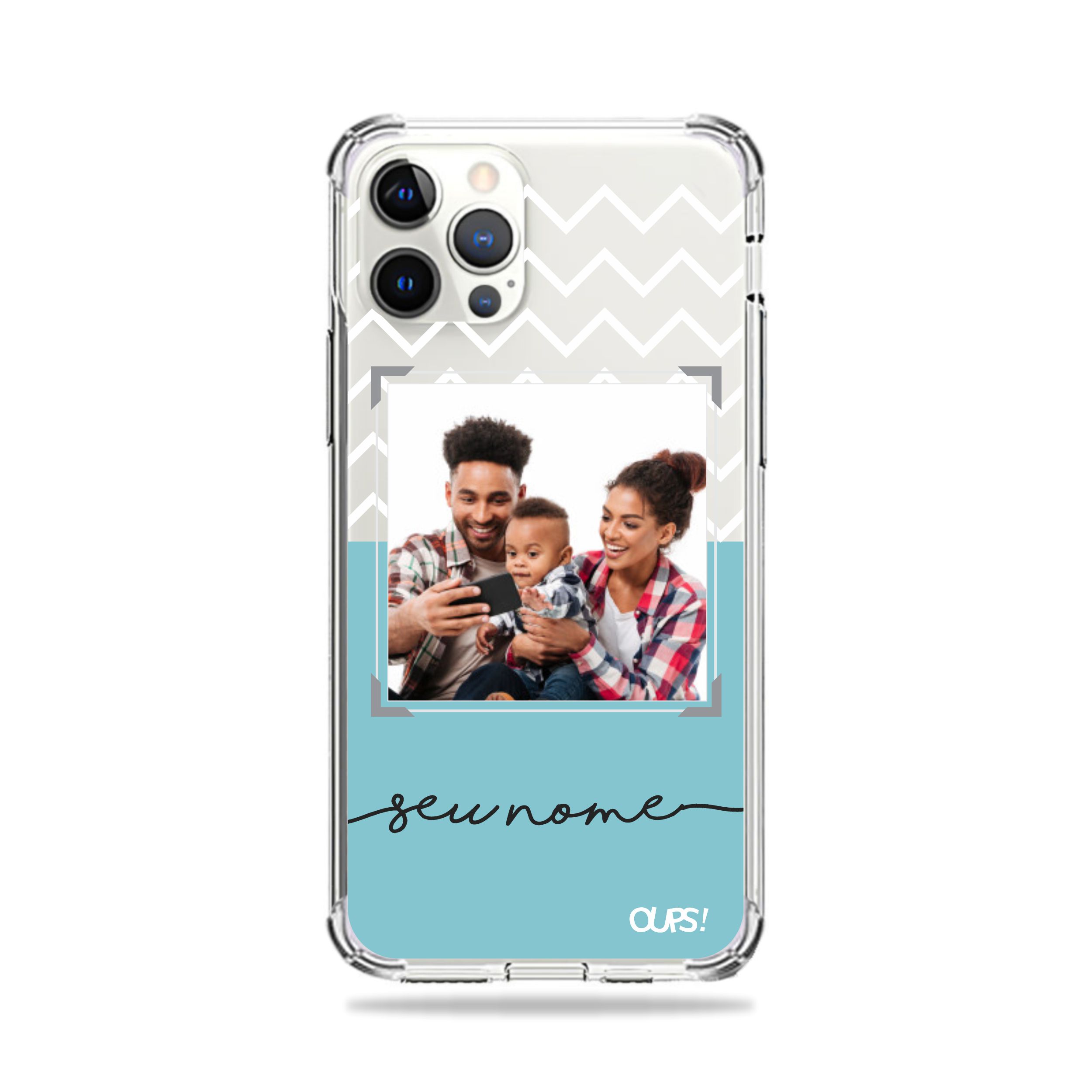 Capinha personalizada com 1 foto central, texto e fundo azul